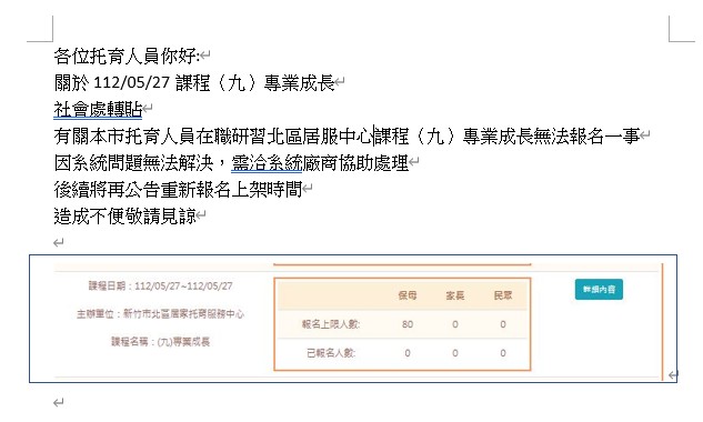 有關本市托育人員在職研習(九)專業成長無法報名一事,因系統問題無法解決,需洽系統廠商協助處理,後續將再公告重新報名上架時間。