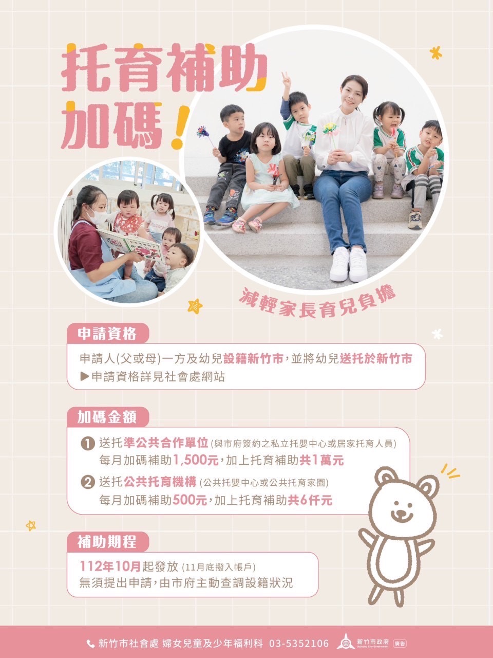 原本的托育補助外,自今年10月起加碼每月1500元,不限定胎次。