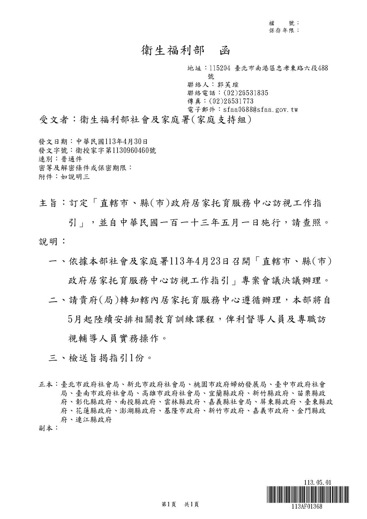 轉知 衛福部社家署訂定之「直轄市、縣(市)政府居家托育服務中心訪視工作指引」