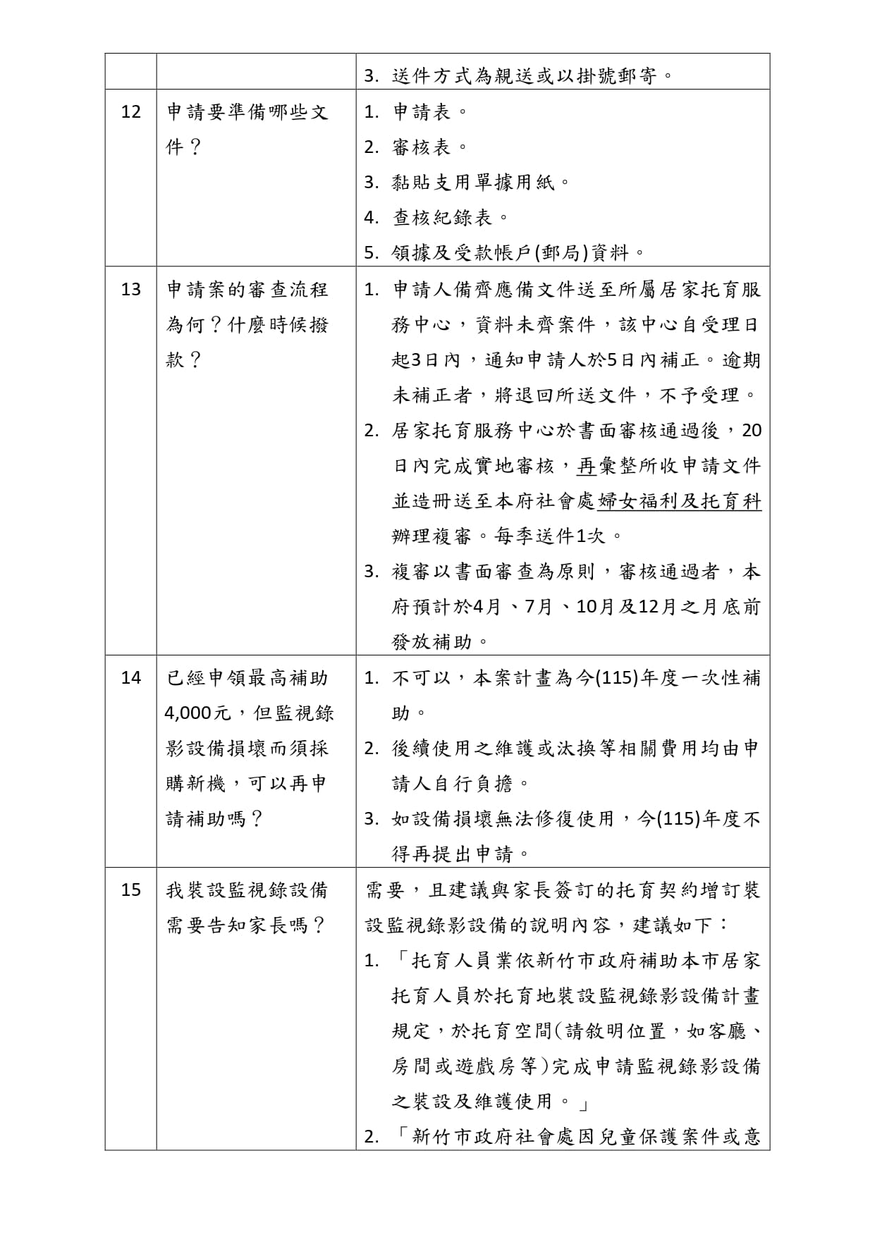 (1)有關補助居家托育人員裝設監視器,因由新竹市政府提供補助及核銷。